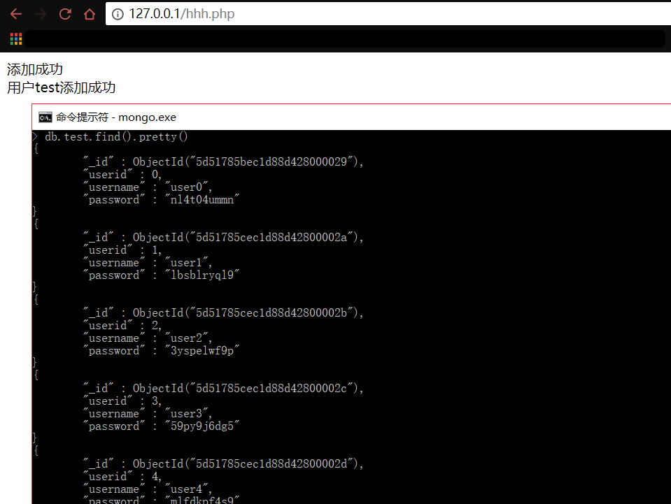 | > db.users.find().pretty() { "_id" : ObjectId("5d56b8469cea49dc4479cd6b"), "username" : "admin", "password" : "123456" }