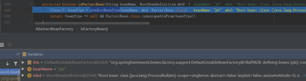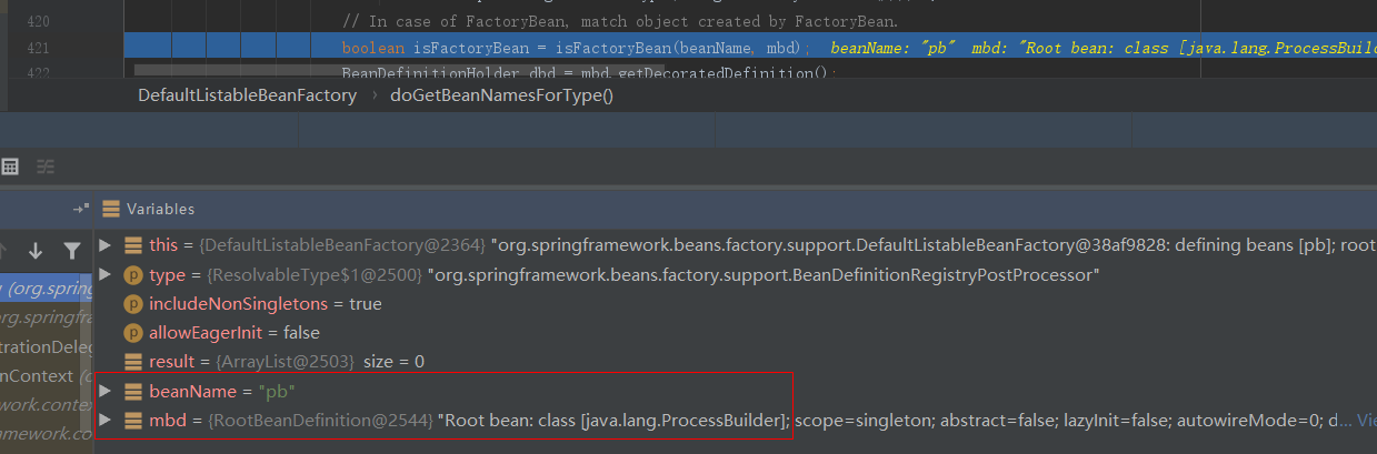 在doGetBeanNamesForType()函数中,调用isFactoryBean()判断当前beanName是否为FactoryBean,此时beanName参数值为”pb”,mbd参数中识别到bean标签中的类为java.lang.ProcessBuilder: