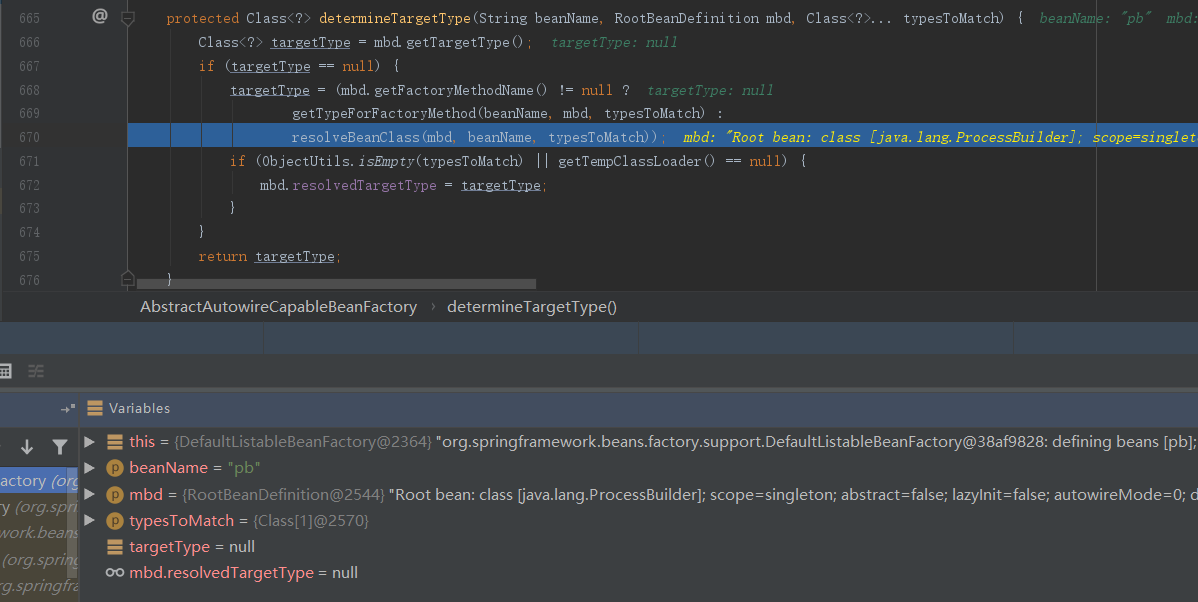 determineTargetType:670, AbstractAutowireCapableBeanFactory (org.springframework.beans.factory.support)