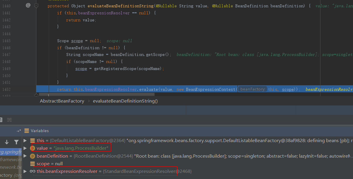 evaluateBeanDefinitionString:1452, AbstractBeanFactory (org.springframework.beans.factory.support)