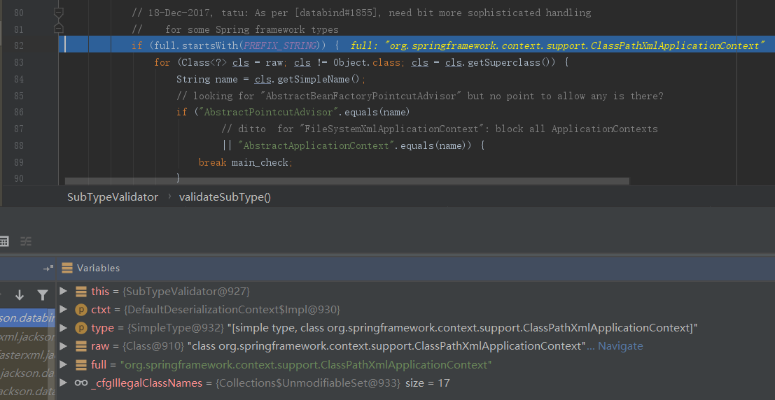 在SubTypeValidator._validateSubType()函数中看到,先进行黑名单过滤,发现类名不在黑名单后再判断是否是以”org.springframe”开头的类名,是的话循环遍历目标类的父类是否为”AbstractPointcutAdvisor”或”AbstractApplicationContext”,是的话跳出循环然后抛出异常: