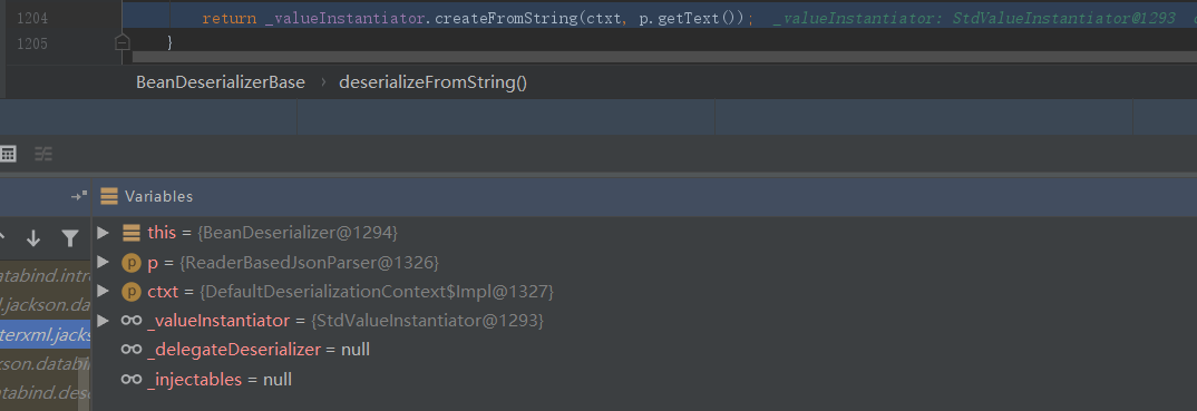 往下调试,发现会调用BeanDeserializerBase.deserializeFromString()函数来反序列化字符串内容,它会返回一个调用createFromString()函数从字符串中创建的实例对象: