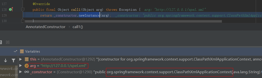 跟进去看StdValueInstantiator.createFromString()函数,此时_fromStringCreator变量为AnnotatedConstructor类实例,参数value值为http://127.0.0.1/spel.xml,接着就是调用AnnotatedConstructor.call1():