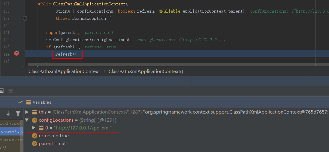 往下调试,会调用到ClassPathXmlApplicationContext类的构造函数,看到configLocations参数值为spel.xml文件所在的URL地址,由于refresh参数值为True,因此会调用到refresh()函数: