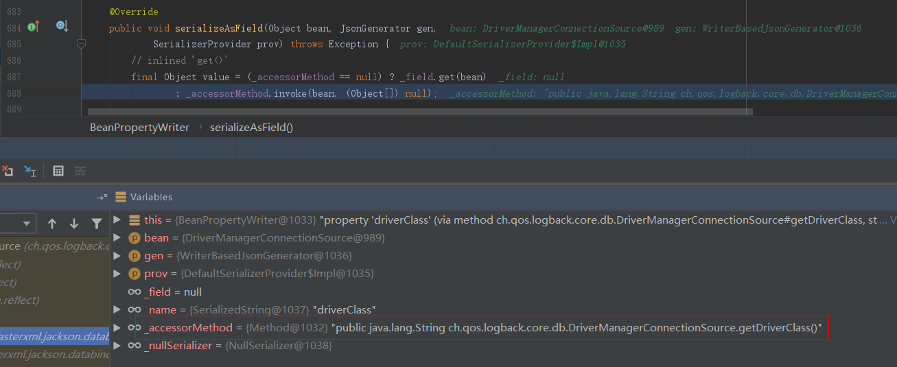 在Jackson序列化的过程中,会通过调用getter方法来获取对象的属性值,会循环调用BeanPropertyWriter.serializeAsField()函数,其中通过反射机制来调用要序列化的对象所属类的getter方法: