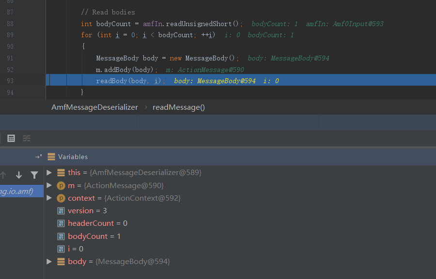 在deserialize()函数中,调用了AmfMessageDeserializer.readMessage()函数来读取Action Message内容,而在其中会调用readBody()函数来进一步读取Action Message的主体内容:
