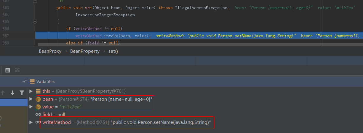 继续往下调试,调用完Person类的构造函数创建了对象实例后,程序会返回到Amf3Input.readScriptObject()函数中继续执行,会通过for循环遍历属性并调用BeanProxy.setValue()函数进行属性值的设置: