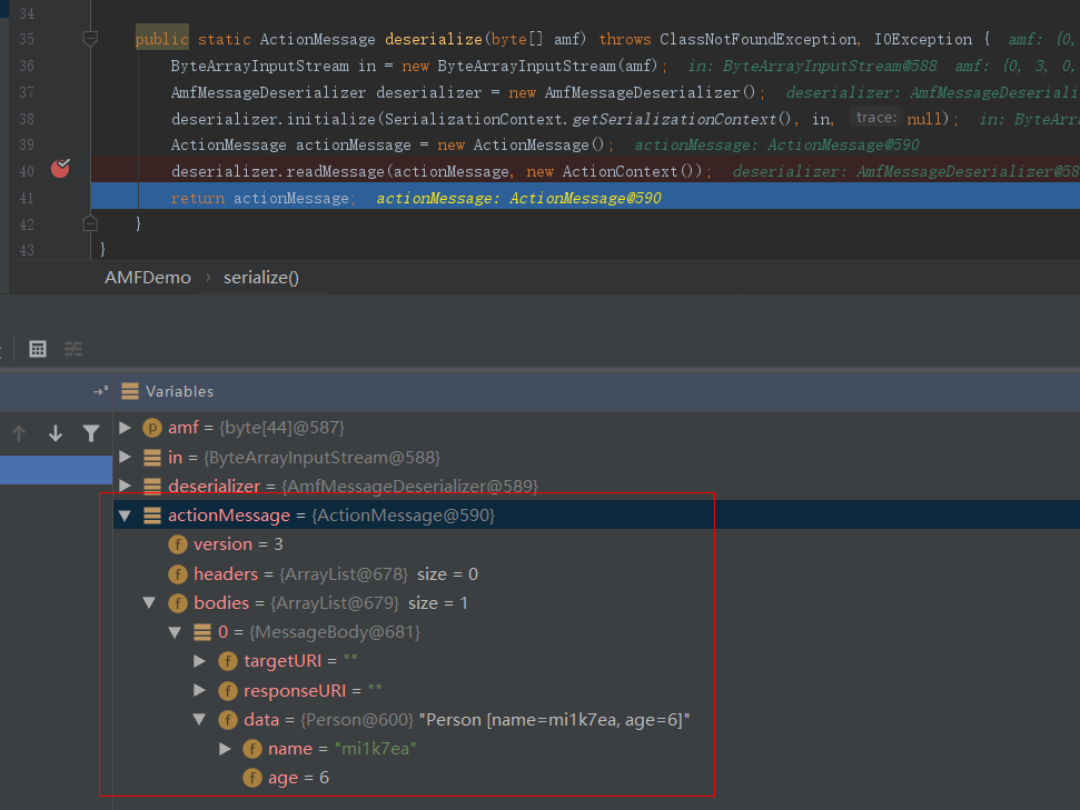 ActionMessage actionMessage = deserialize(amf); System.out.println("反序列化:" + actionMessage); }