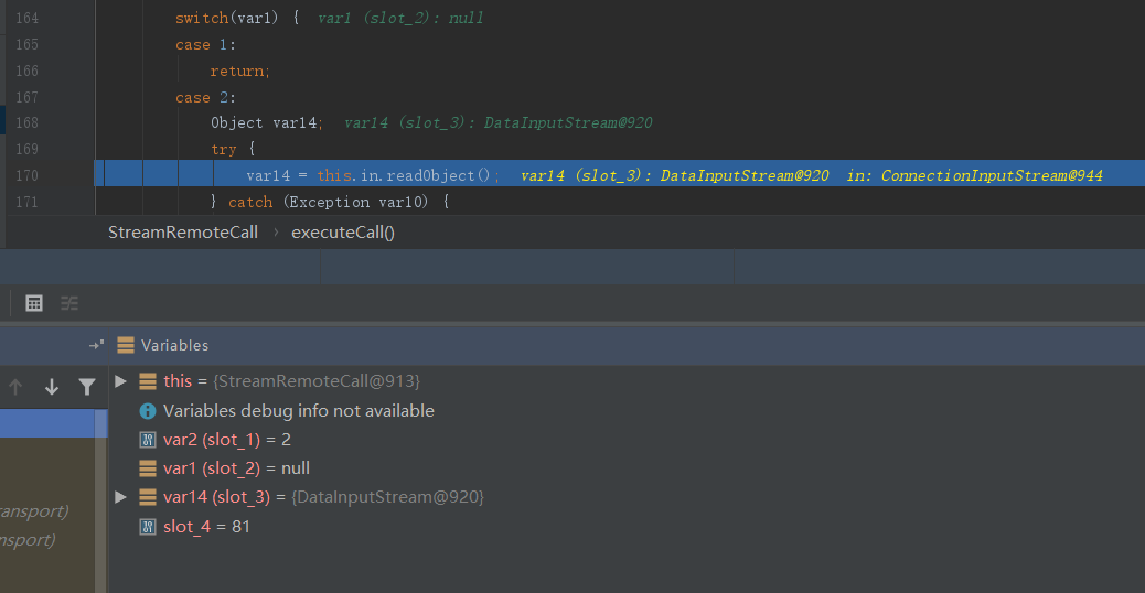 跟进StreamRemoteCall.executeCall()函数中,看到该方法直接从in数据库中进行了readObject()操作: