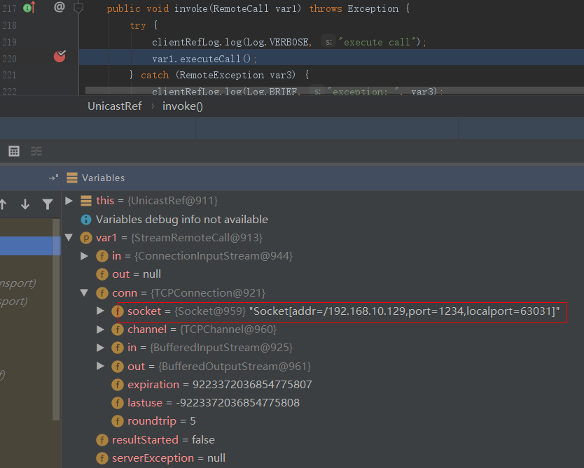 我们直接在UnicastRef.invoke()方法上打断点,调试直接运行到这,此时函数调用栈如下: