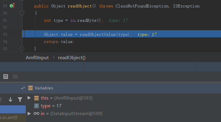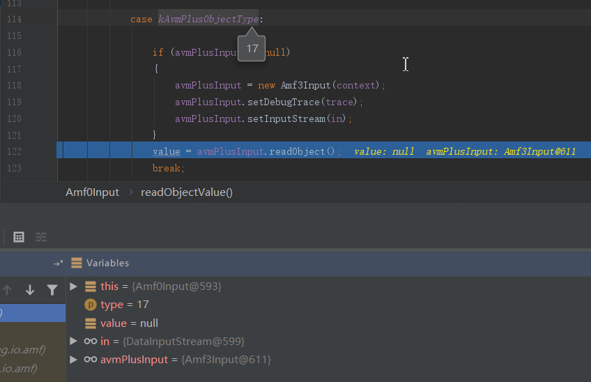 往下跟进去,看到调用Amf0Input.readObject(),其中获取到type为17,然后调用readObjectValue():