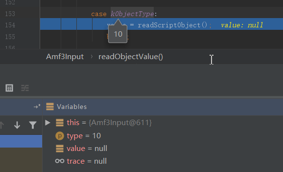 跟进Amf3Input.readObject()函数,这里获取到type为10,再调用Amf3Input.readObjectValue():