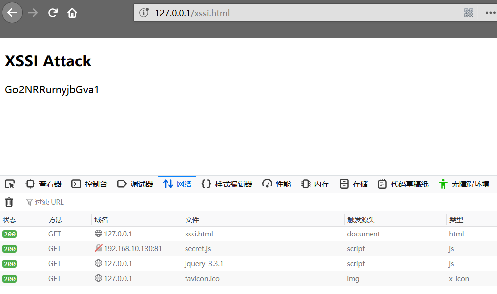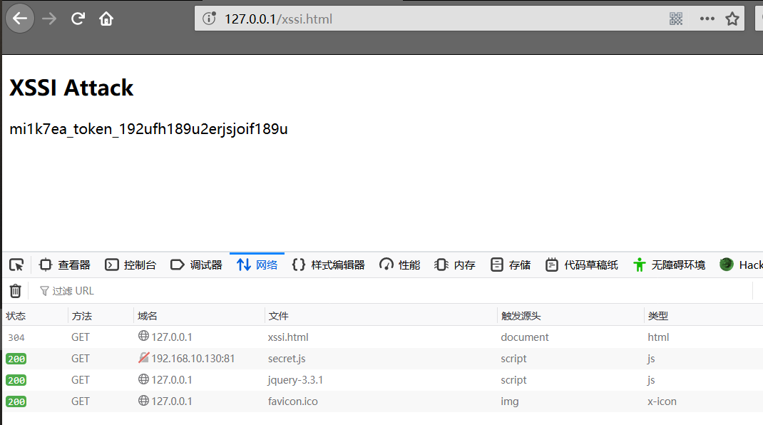改文件即XSSI的攻击实现。通过script标签的src属性来跨域加载目标服务端的secret.js文件进来,然后将窃取到的token信息显示在页面上: