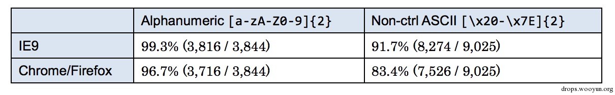 下图是引自wooyun文章,能够被浏览器认定为有效的JS变量,当字符编码为UTF-16的时候的数字字母组合,ie 9将其99.3%认为是有效的js标示符,高于Chrome和Firefox: