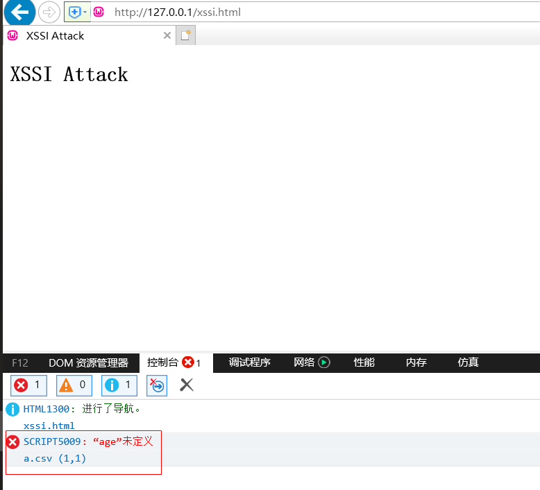 此时发现和前面的报错是一样的。没关系,我们直接修改xssi.html,添加age前面的name的变量的定义,发现报错信息就会往后识别了: