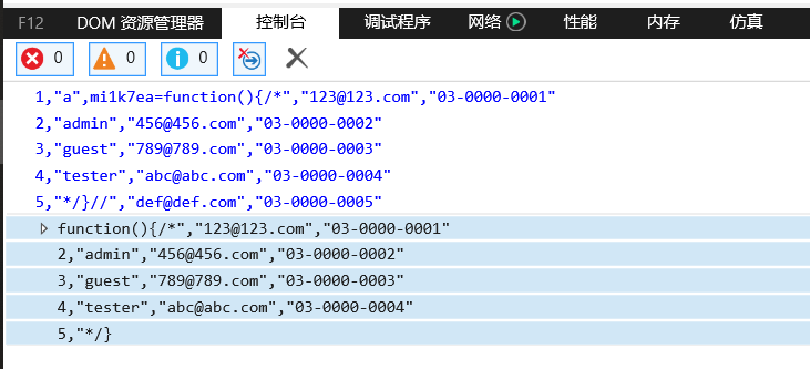 为啥能成功执行?我们将CSV文件内容直接放到IE的Console中运行,浏览器是能够成功识别为JS代码并定义了一个名为mi1k7ea的JS函数: