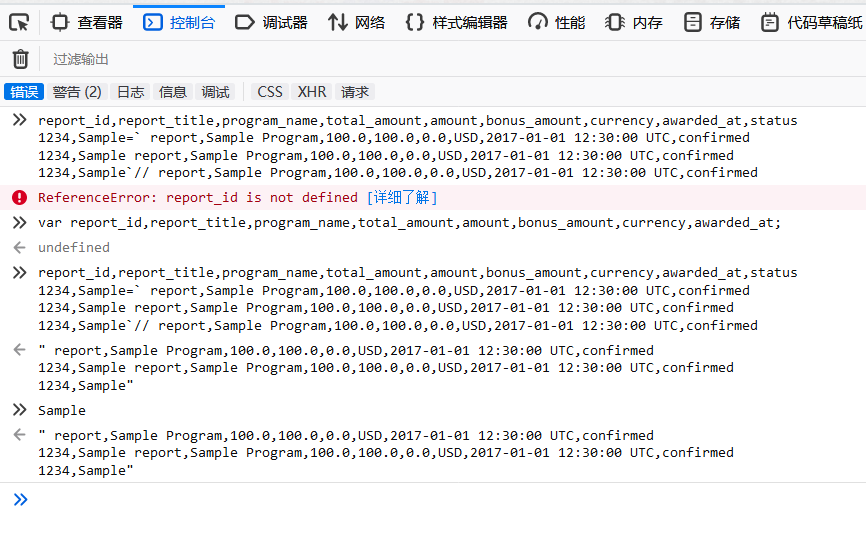 但是这段CSV在Firefox和Chrome上的Console上是能成功识别并执行的,也就是说构造本身是没问题的: