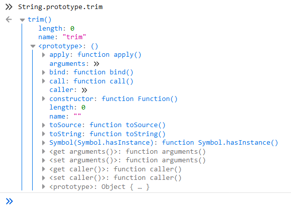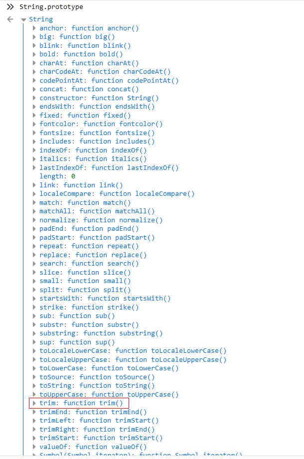 我们到浏览器的Console试下就知道。先看下String类型的原型链确实存在trim()这个内置函数,当然,如果含有敏感信息的String类型的局部变量调用了其他如下列出的内置方法我们都可以直接同理利用: