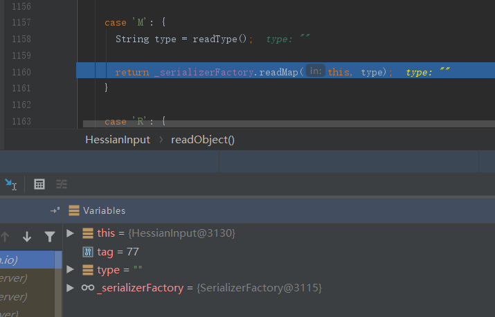 跟进去HessianInput.readObject()函数中,其中先获取tag值为77即’M’,然后匹配到对应的switch语句中调用readMap()函数: