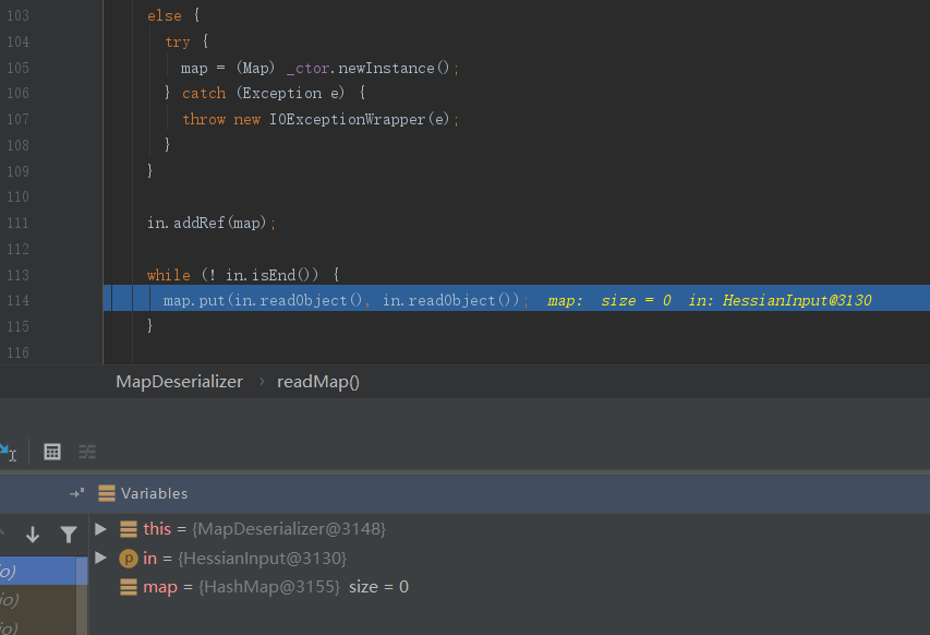 跟进去MapDeserializer.readMap()函数,先新建一个HashMap实例,然后循环遍历HessianInput的内容,将其中的键值都进行readObject()操作然后再put进该新建的HashMap实例中: