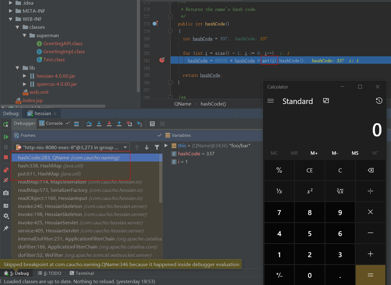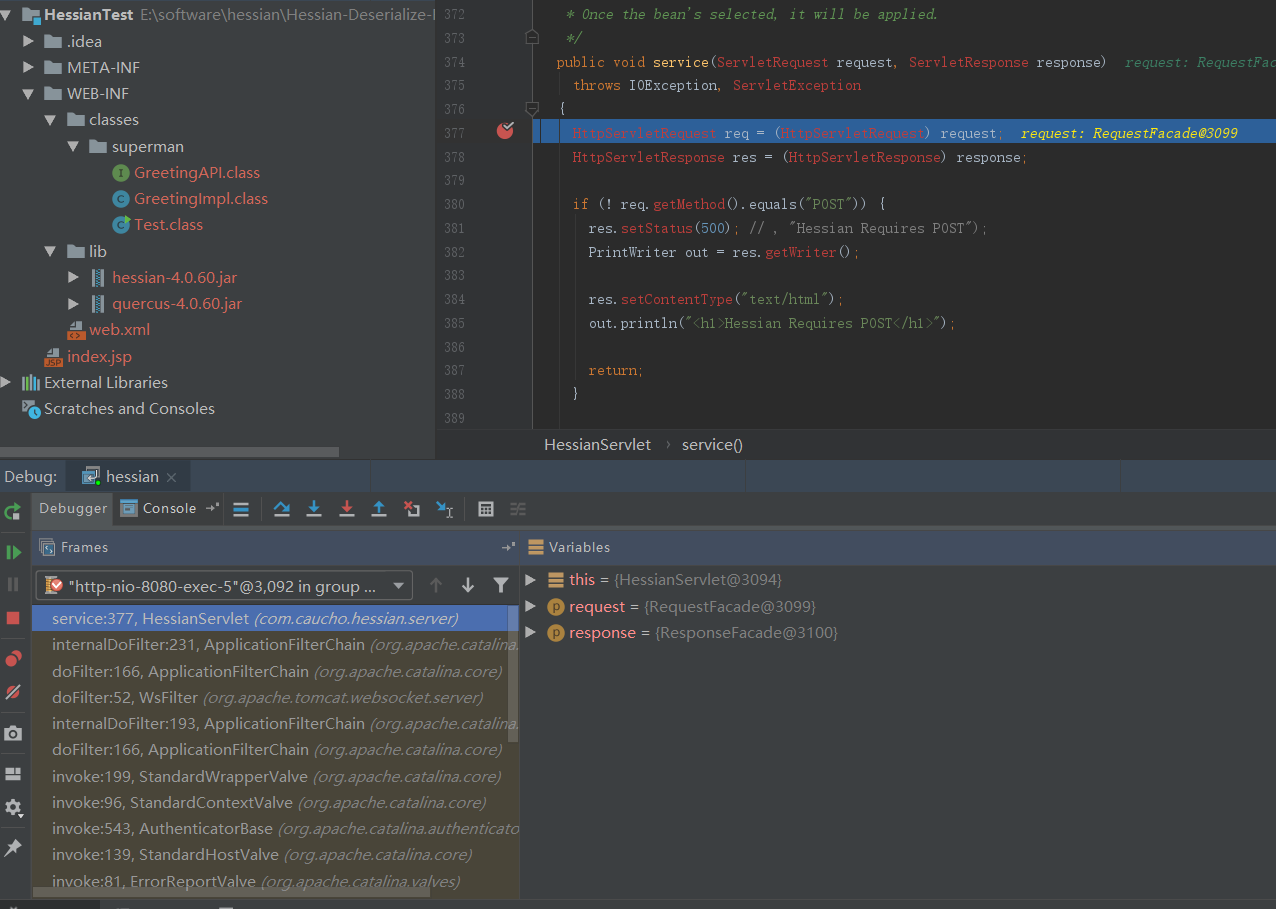 跟进该类,直接在service()函数中下断点,然后浏览器再次访问http://127.0.0.1:8080/HessianTest/hessian页面即可停在断点处:
