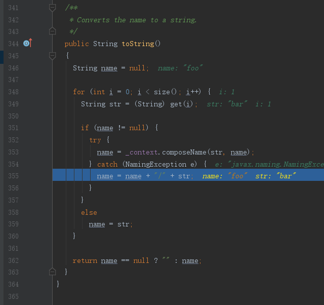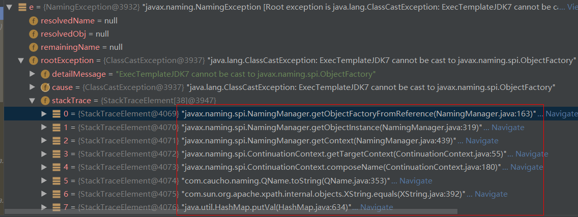此时我们打开看下NamingException类实例即变量e中的stackTrace,验证了前面的分析,即QName.toString()中的漏洞点是在composeName()调用中,这里由于NamingException异常导致调用了NamingManager.getContext()来查找另一个程序继续执行,这其中有调用了NamingManager.getObjectFactoryFromReference()函数来加载payload中设置的恶意Reference地址指向的服务上的类,从而导致RCE: