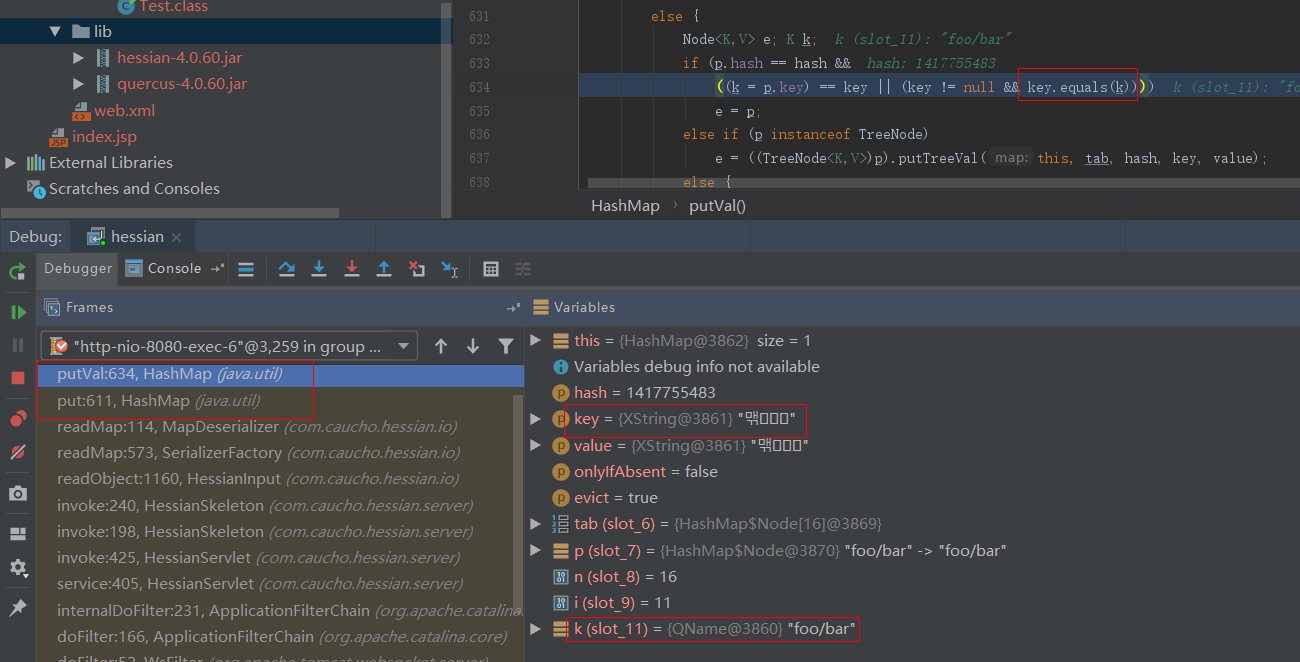在第二次调用到HashMap.put()函数时,此时调用了XString的equals()函数: