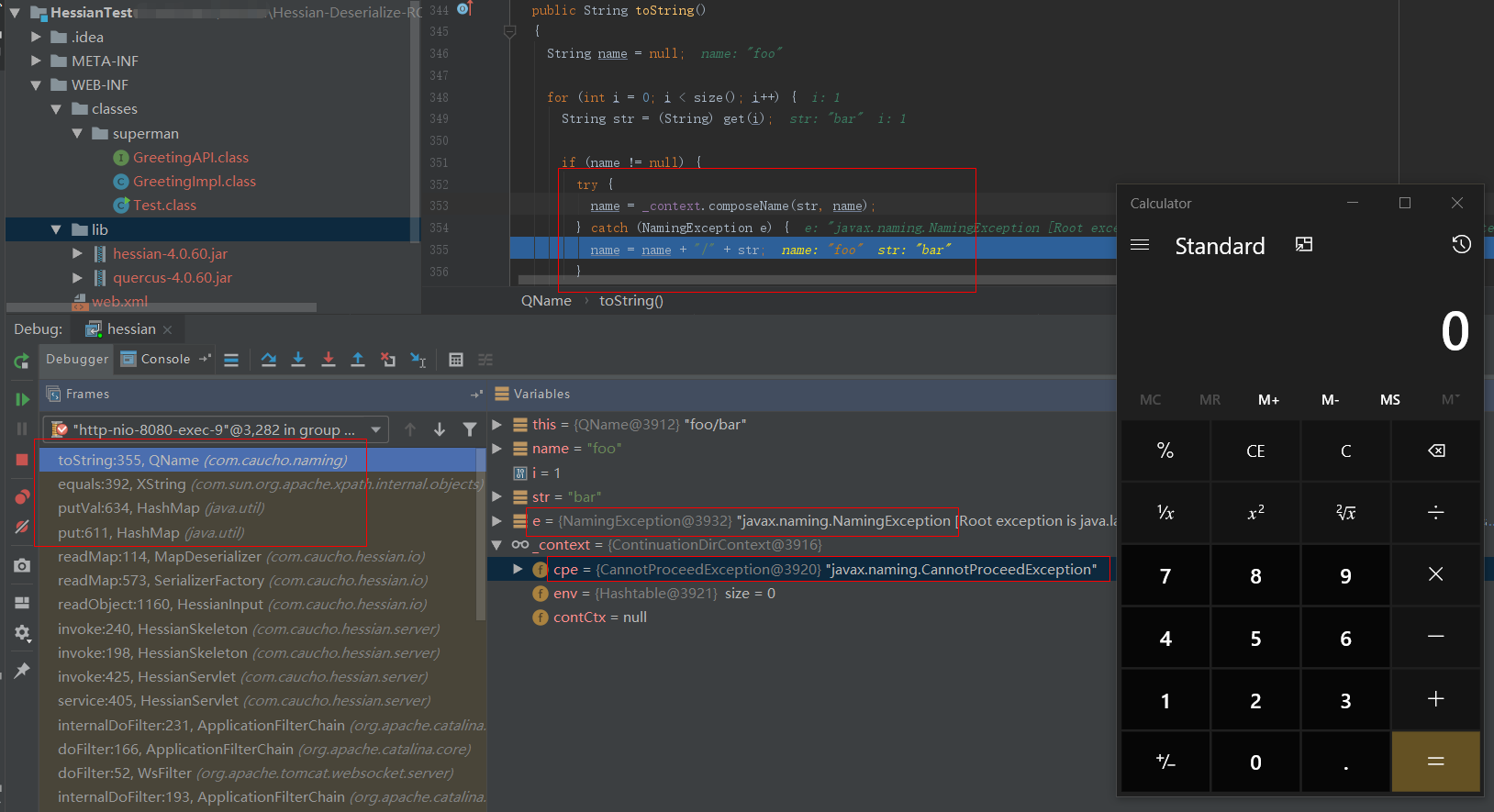 这里readObject()处理过程也是一样的,简单地说就是获取序列化内容的类类型、属性值等(这里为反序列化获取com.caucho.naming.QName类及其属性值等,具体过程可自行调试下)。此处下断点然后F8过两次就能直接触发弹计算器了。