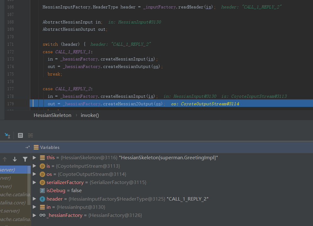 跟下去,在invoke()函数中会调用相关函数读取头类型,并在下面的switch语句中匹配符合条件的头类型进入不同的逻辑,这里获取到的头类型是CALL_1_REPLY_2,则调用createHessianInput()函数创建Hessian输入流和输出流: