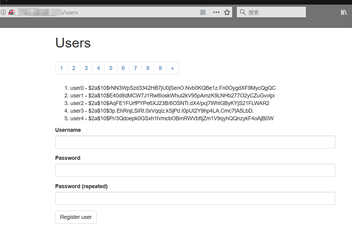 漏洞复现 访问目标站点/users接口,是个提交用户名和密码的注册用户的表单,且会在页面中显示出来: