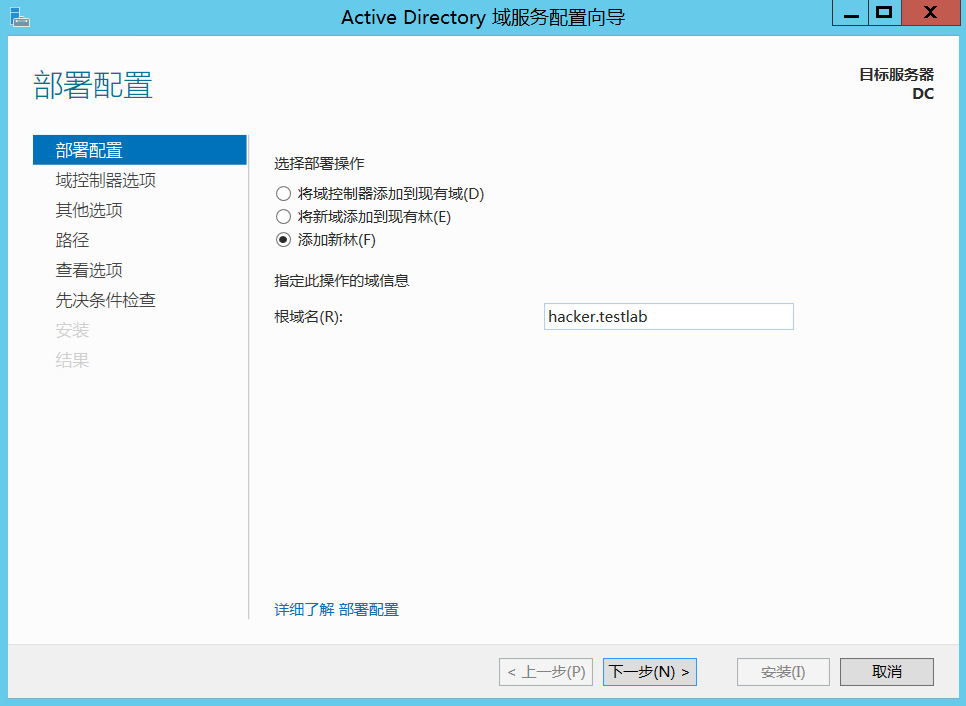 AD 域服务安装完成。接着,进入“Active Directory 域服务配置向导”页面,在部署操作中单 击选中“添加新林”单选按钮并输入根域名(必须使用允许的 DNS 域命名约定) 。将根域名设置 为“hacke.testlab”: