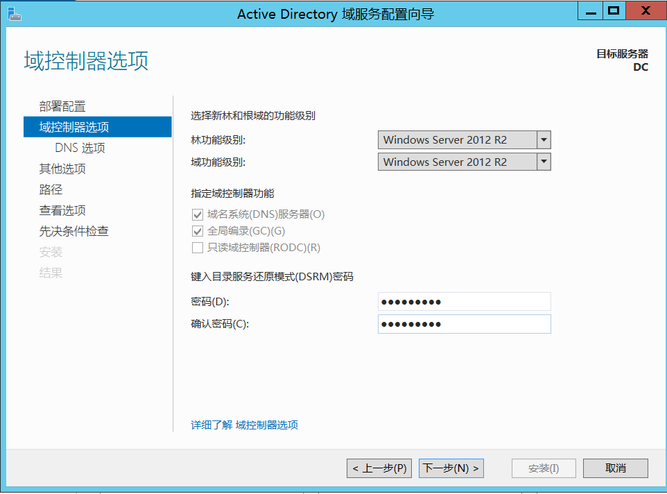 在“域控制器选项”页面,将林功能级别、域功能级别都设置为 Windows Server 2012 R2,如图所示。在创建新林时,在默认情况下选择 DNS 服务器,林中的第一个域控制器必须是全局目录服务器且不能是只读域控制器(RODC) 。输入目录服务还原模式密码,在开机进入安全模式修复 AD 数据库时将使用此密码。