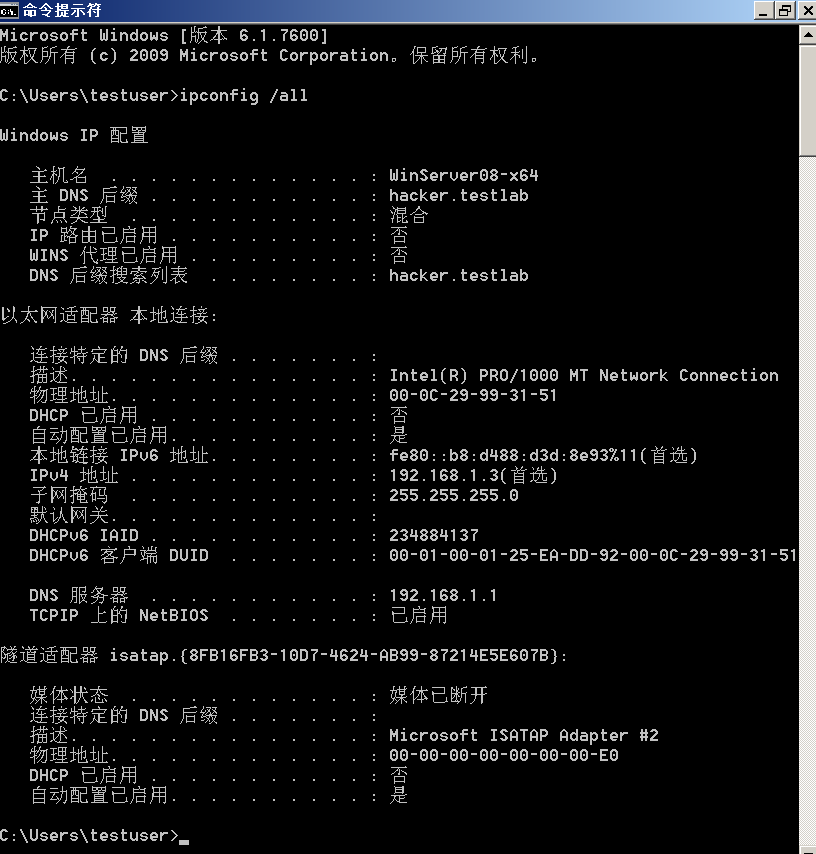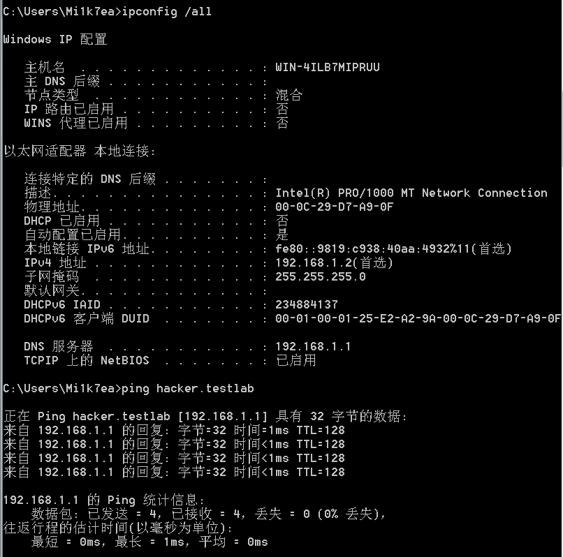 将Windows 7系统加入该域,先设置IP地址为192.168.1.2,DNS地址为192.168.1.1, 然后查看设置并运行ping hacker.testlab命令进行测试: