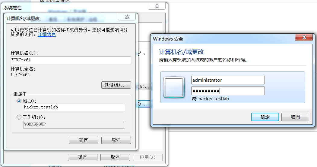 接下来,将主机加入域,更改计算机名为“WIN7-x64”,将域名更改为 “hacker.testlab”。 单击“确定”按钮后,会弹出要求输入拥有权限的域账户名称和密码的对话框。 在这里,输入域管理员用户账号和密码:
