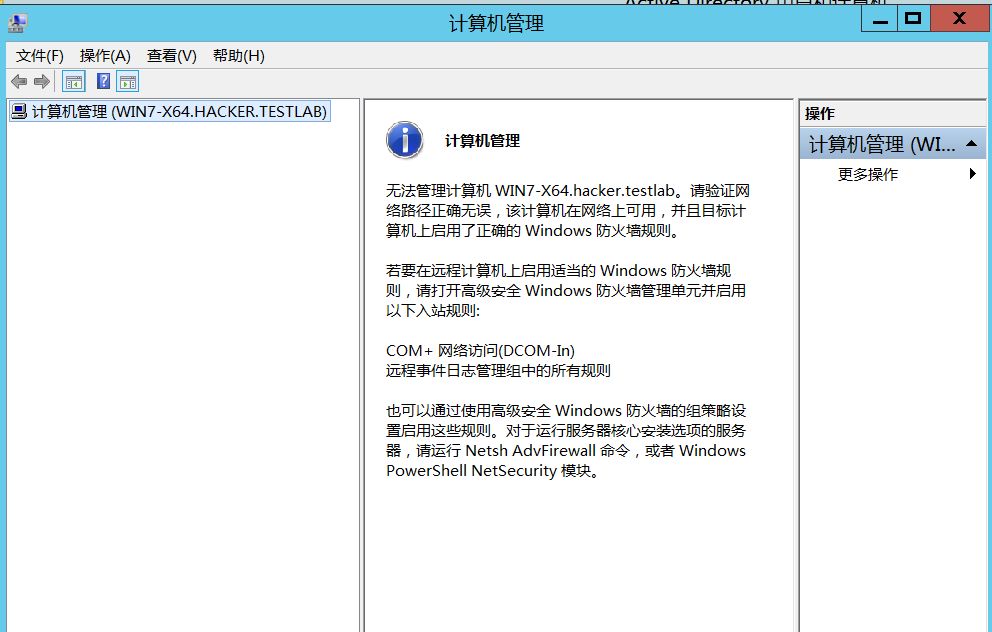 当我们右键该项选择“所有任务->管理”时,会报如下错误,这是防火墙拦截的原因: