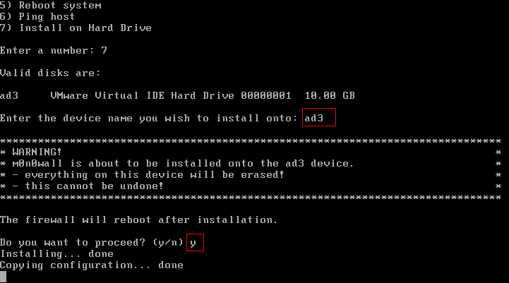 接着选择硬盘,这里只有一块名为ad3的硬盘,选择它并输入确认y: