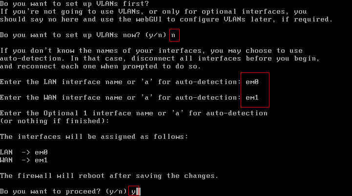 如图输入,第一个设置LAN即内网网卡的填em0即通过Mac地址找到的对应Host-only那个网卡,第二个设置WAN即外网网卡的填em1即通过Mac地址找到的对应桥接那个网卡: