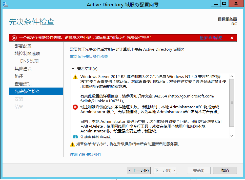 此时我们去创建或修改Administrator用户的密码后再点击“重新运行先决条件检测”,这时候发现就OK了,直接单击“安装”即可。