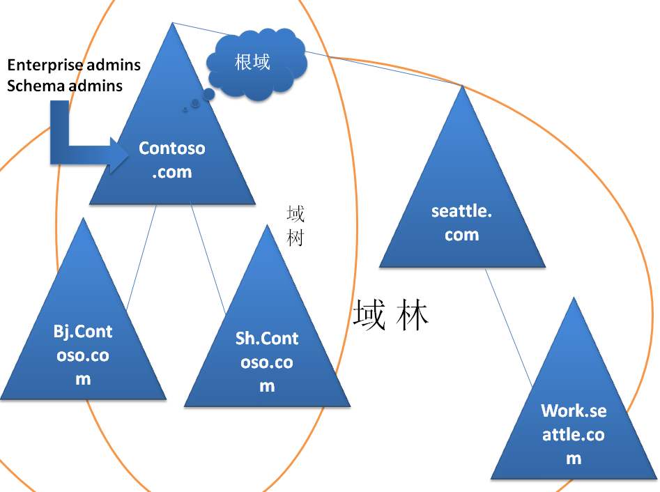 域树/域林内的所有域共享一个活动目录,每个域只存储该域内的数据。