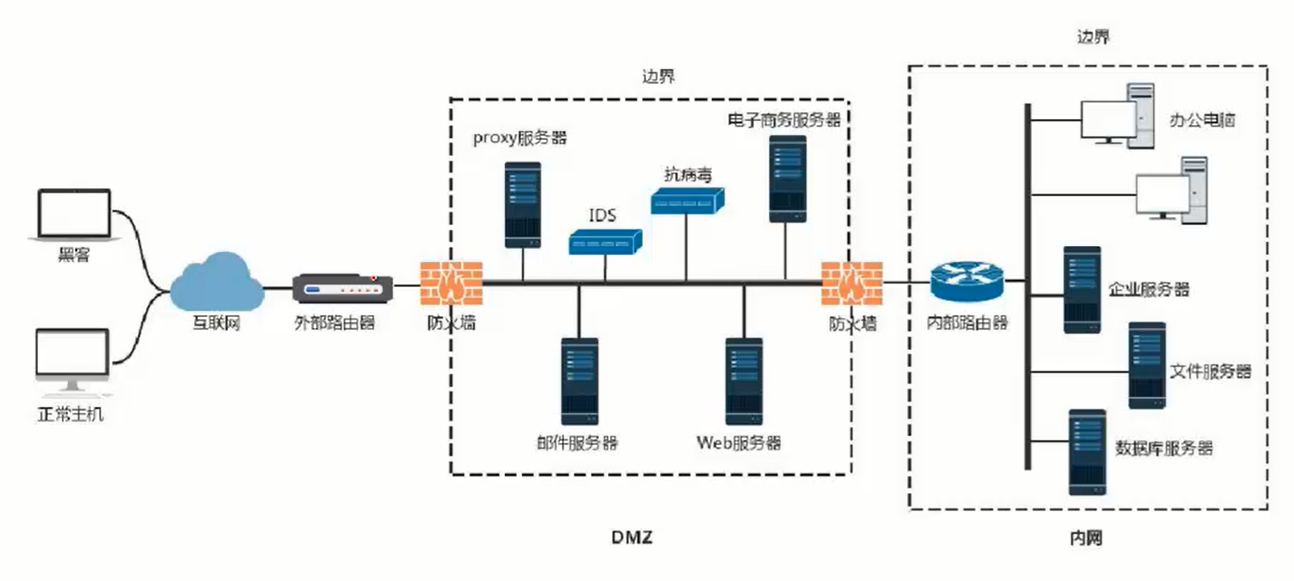 两个防火墙之间的空间被称为DMZ。安全性:Internet < DMZ < 内网。