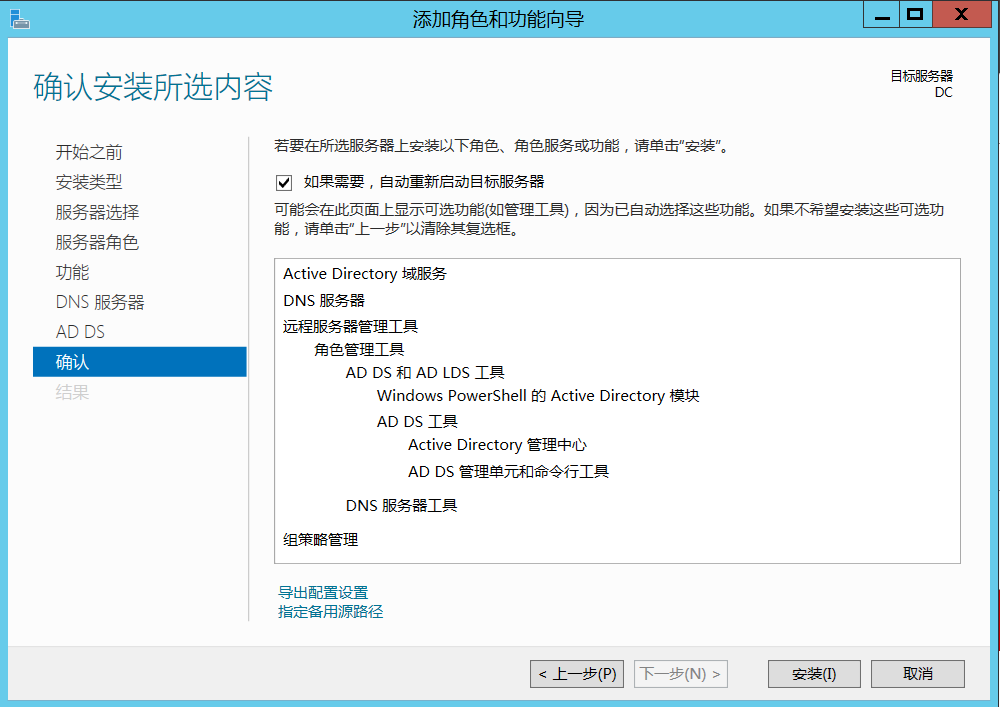 在“功能”页面,保持默认设置,单击“下一步”按钮,进入“确认”页面。确认需要安装 的组件后,勾选“如果需要,自动重新启动目标服务器”复选框,然后单击安装: