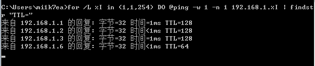 1 | for /L %I in (1,1,254) DO @ping -w 1 -n 1 192.168.1.%I | findstr "TTL=" |