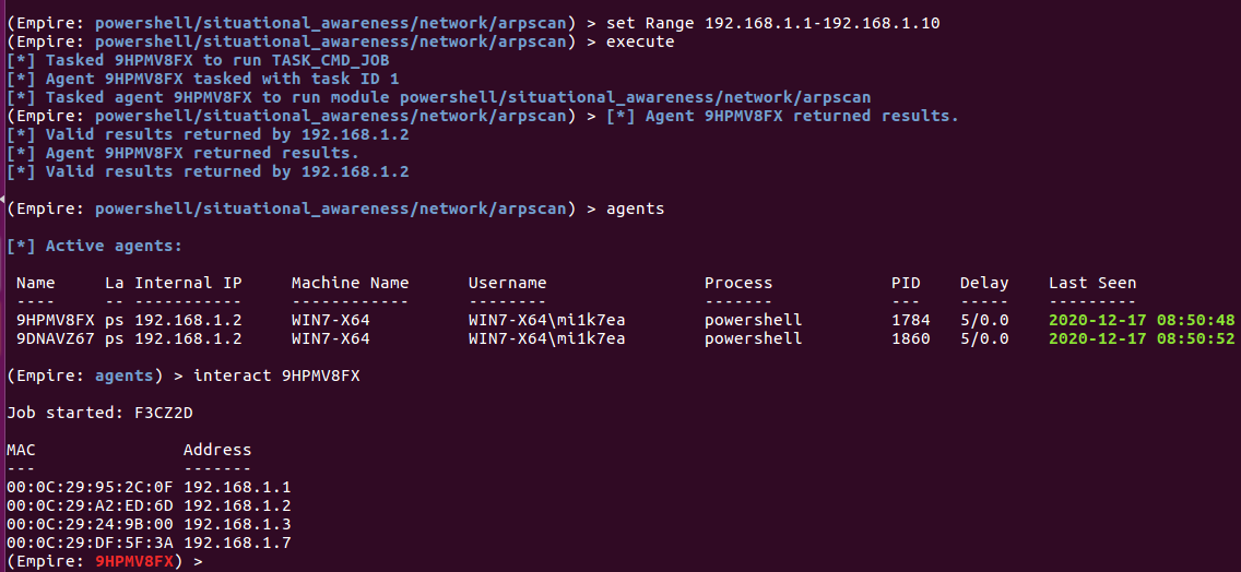 Empire中内置了arpscan模块,用于在局域网内发送ARP数据包、收集活跃主机的IP地址和MAC地址信息。
